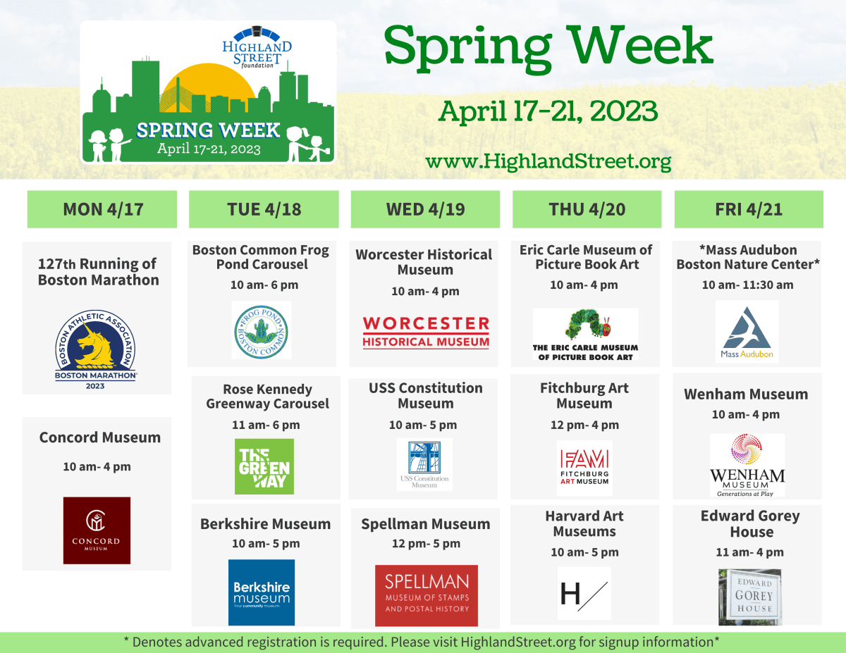 Learn more about Spring Week on the Highland Street Foundation’s website and explore other participating institutions below: