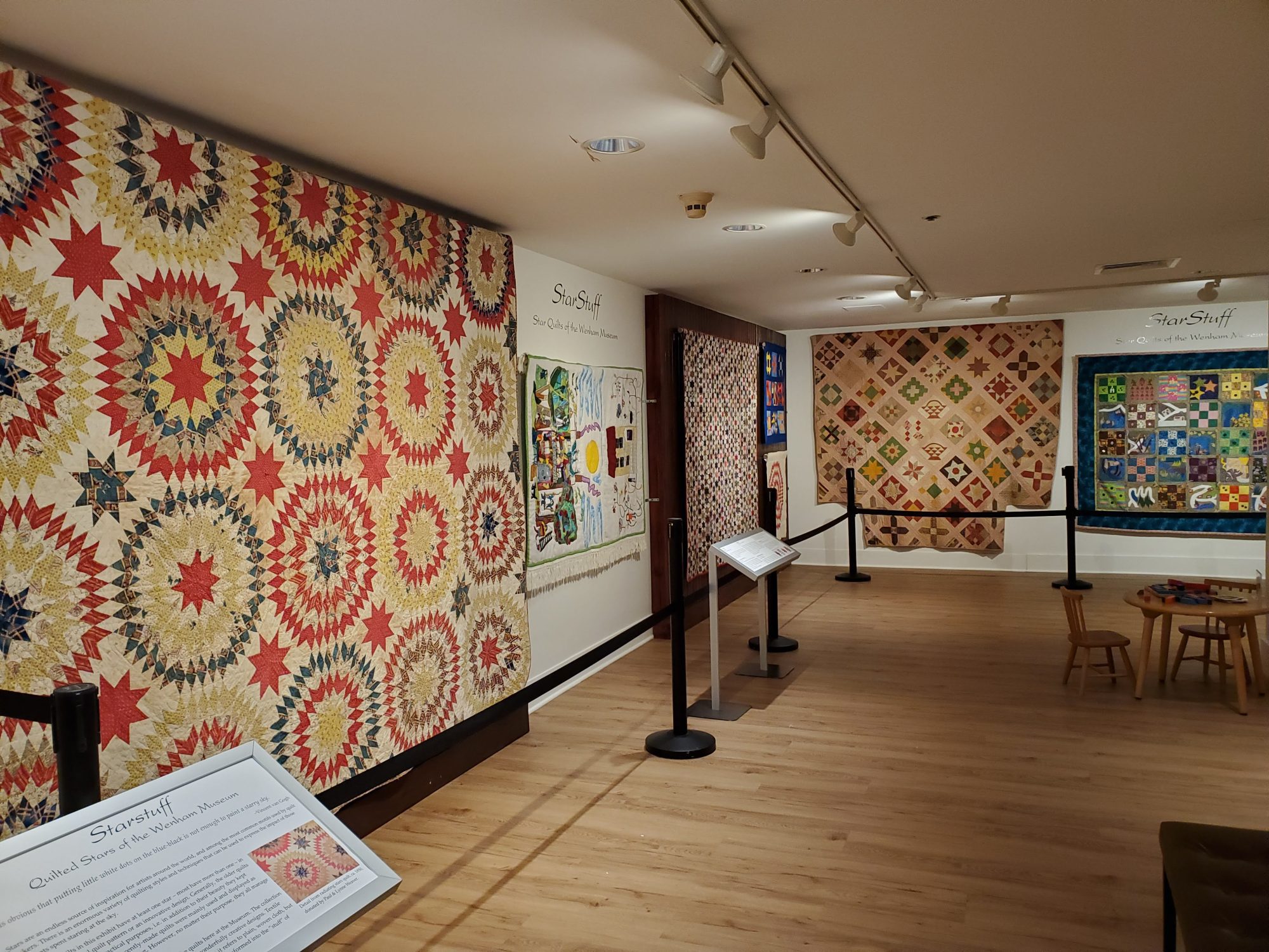 This month, we’ll explore the museum’s current quilt exhibition, Starstuff: Star Quilts of the Wenham Museum. We will look at the quilts and see what colors and shapes we can find.