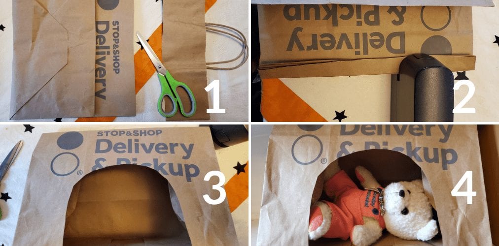 A grow-up may need to help you get started on your cave. To make your cave, cut the handles off of the paper bag. Fold over the top edge of the bag and staple. Then, cut an opening in the paper bag for the animals to go in and out.